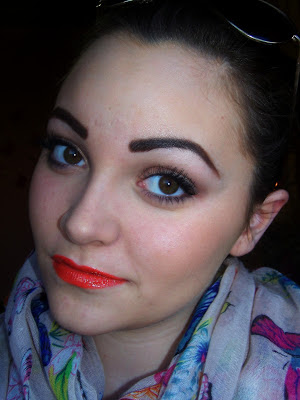 ez az élénk, narancsszínű rúzs ezzel az egyszerű sminkkel.